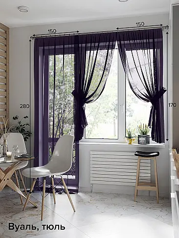 206735 Тюль 150х240, 250, 260, 270, 280, 290 см — 1 шт., тюль 150х170 см — 2 шт., подхват — 2 шт.